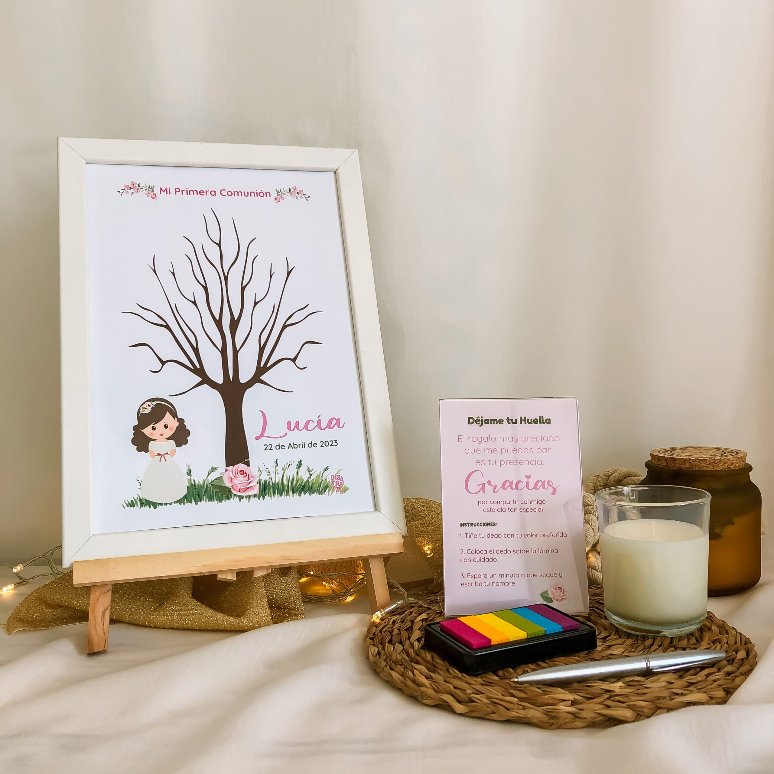 Nuestra marca diseña colecciones completas para Comuniones, del mismo modo encontrarás en esta tienda productos a juego con el Árbol de Huellas para Comuniones de la Colección Rosas Rosas.