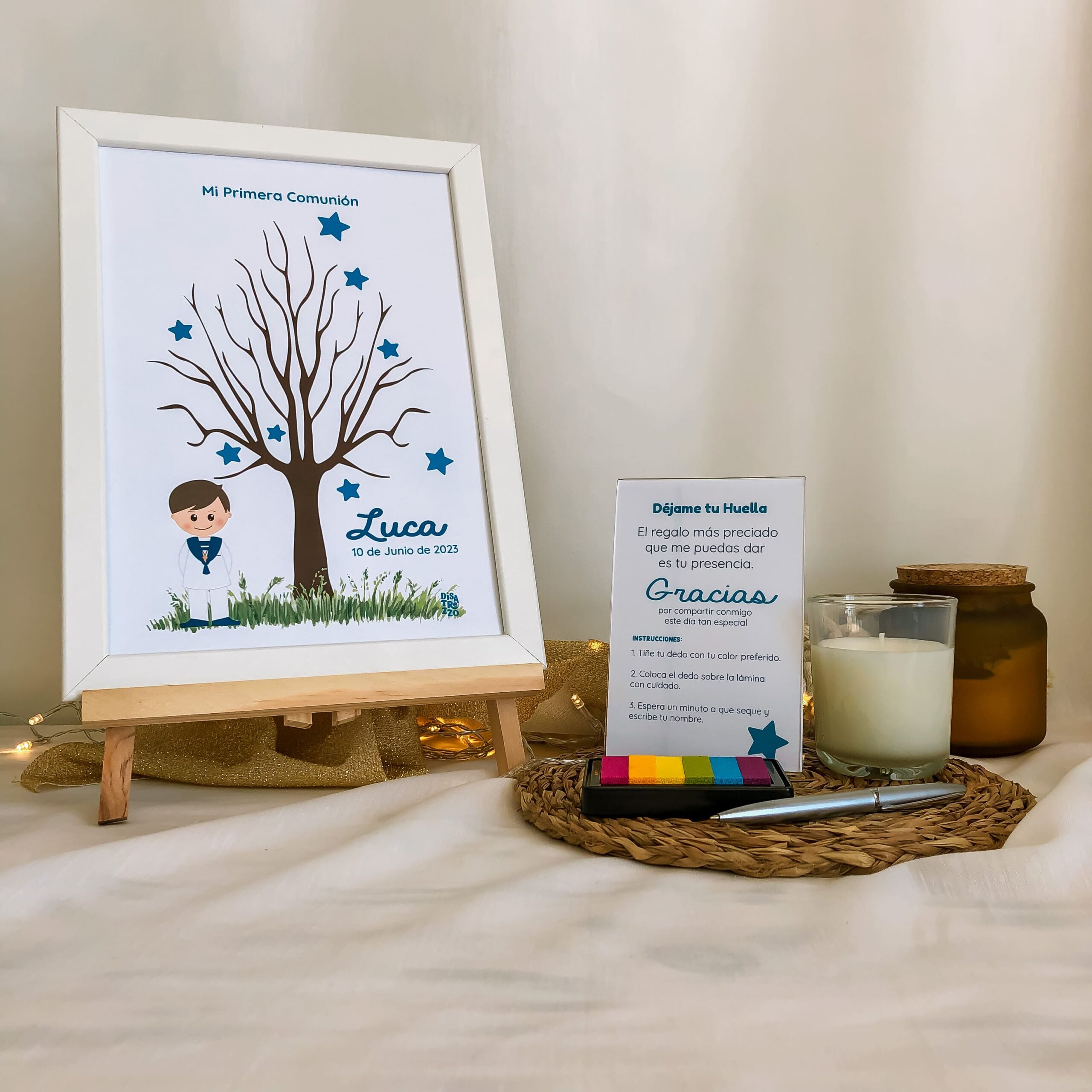 Nuestra marca diseña colecciones completas para Comuniones, del mismo modo encontrarás en esta tienda productos a juego con el Árbol de Huellas para Comuniones de la Colección Vichy Azul.