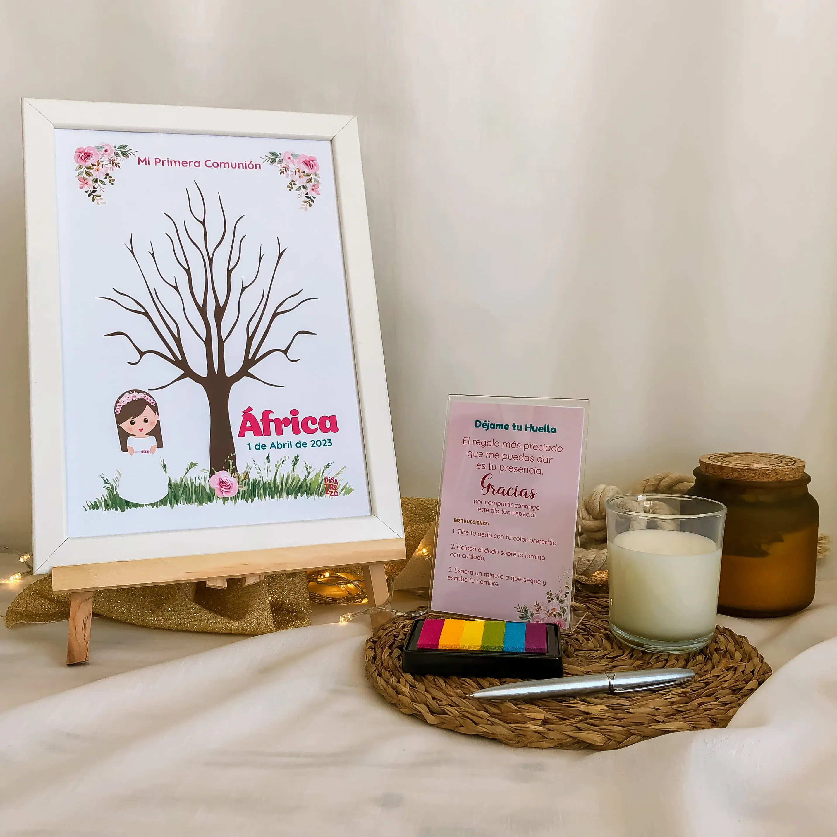 Nuestra marca diseña colecciones completas para Comuniones, del mismo modo encontrarás en esta tienda productos a juego con el Árbol de Huellas para Comuniones de la Colección Vichy Rosa.