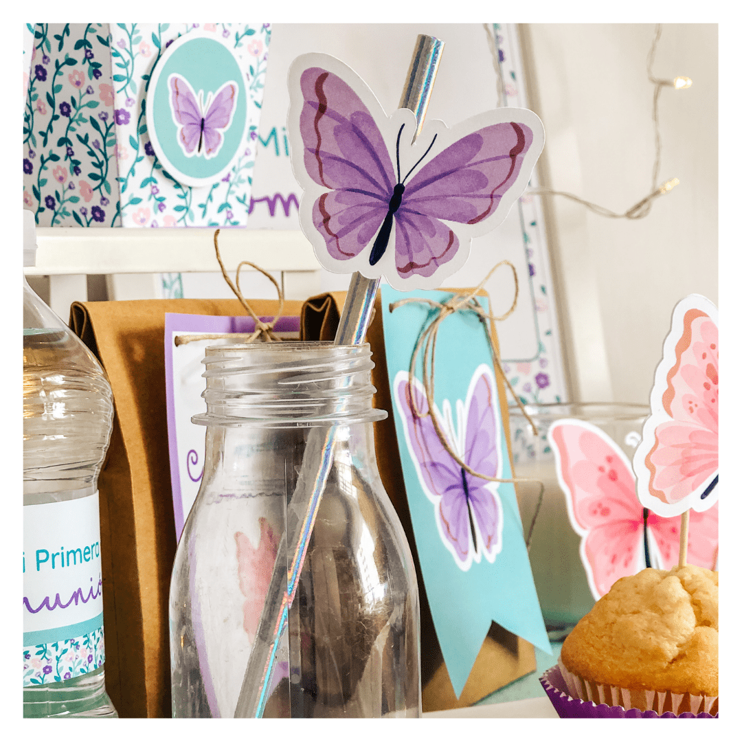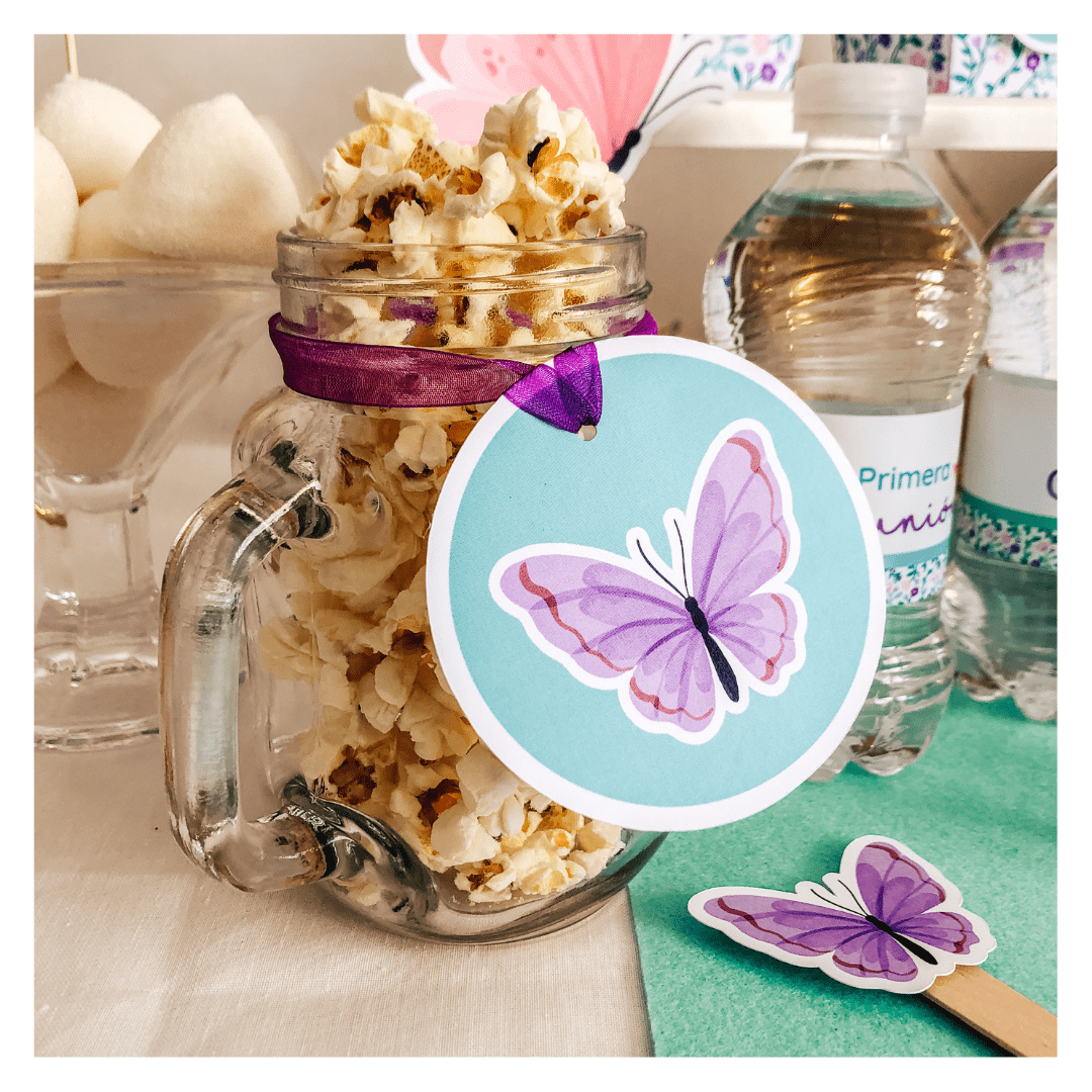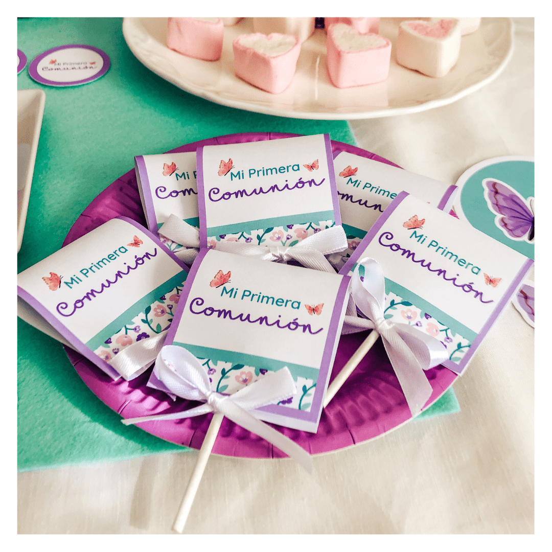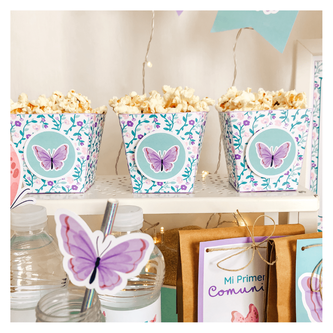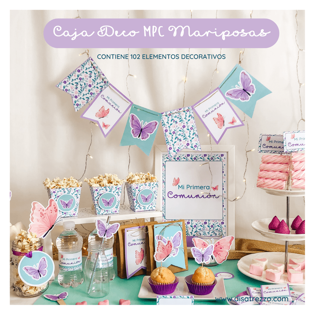 La Caja de Decoración para Comuniones Mariposas contiene todos los elementos necesarios para Decorar una Bonita Mesa de Dulces: